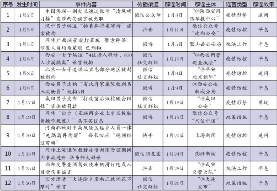 1月網(wǎng)絡涉法謠言辟謠榜單共梳理、匯總12起熱點事件,圍繞謠言持續(xù)時間、傳播渠道、產(chǎn)生地域、類型以及辟謠平臺等維度綜合分析,并篩選兩起關(guān)注度較高、具有典型意義的案例研判,以期為網(wǎng)絡辟謠工作提供參考借鑒。