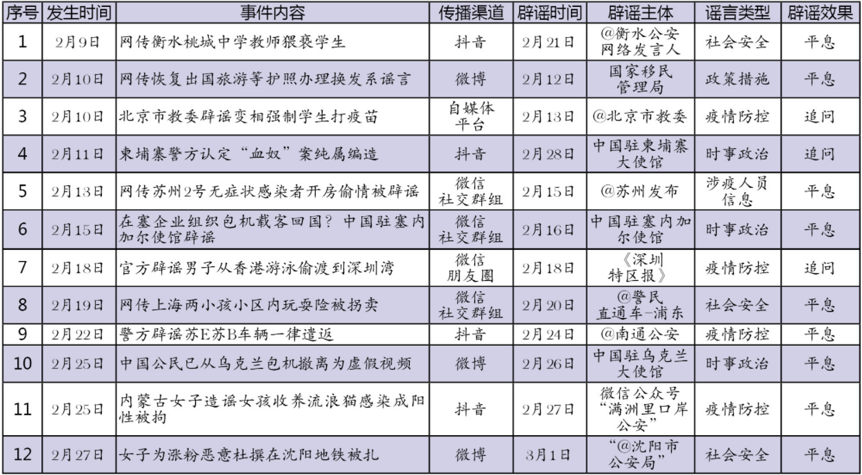 2月網(wǎng)絡涉法謠言辟謠榜單共梳理、匯總12起熱點事件,圍繞謠言持續(xù)時間、傳播渠道、產(chǎn)生地域、類型以及辟謠主題等維度綜合分析。法治網(wǎng)輿情中心從中篩選兩起關(guān)注度較高、具有典型意義的案例研判,以期為網(wǎng)絡辟謠工作提供參考借鑒。