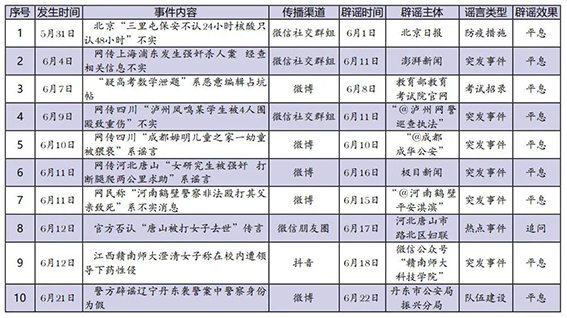 6月網(wǎng)絡(luò)涉法謠言辟謠榜單共梳理、匯總10起熱點事件,圍繞謠言持續(xù)時間、傳播渠道、產(chǎn)生地域、類型以及辟謠平臺等維度綜合分析,篩選兩起關(guān)注度較高、具有典型意義的案例研判,以期為網(wǎng)絡(luò)辟謠工作提供參考借鑒。