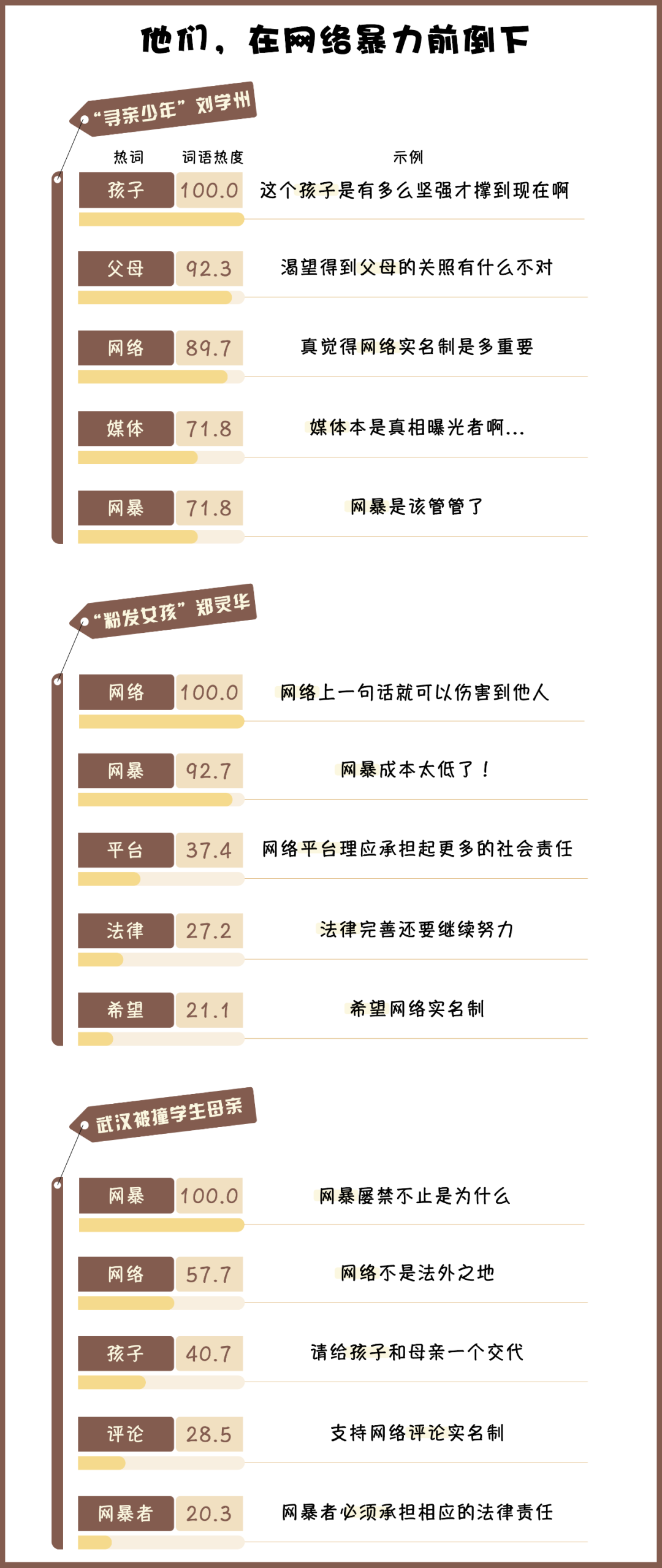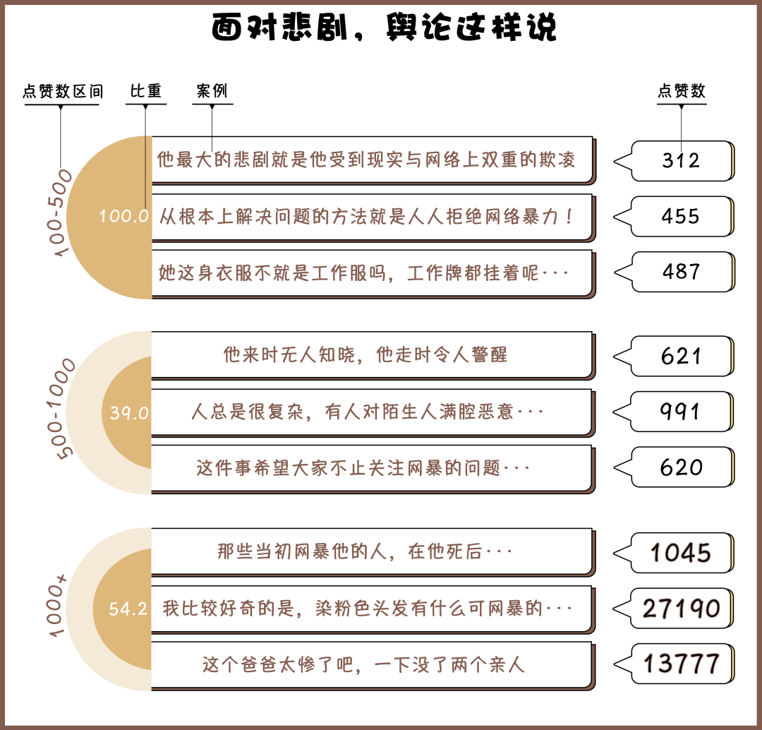 近年來(lái),因網(wǎng)絡(luò)暴力導(dǎo)致的悲劇事件頻出,例如“尋親少年”劉學(xué)州因與親生父母親的矛盾遭受網(wǎng)絡(luò)暴力,最終選擇留下一封“來(lái)時(shí)即輕,還時(shí)亦凈”的遺書后自殺;“粉發(fā)女孩”鄭靈華因染粉色頭發(fā)被網(wǎng)暴導(dǎo)致嚴(yán)重抑郁,抗?fàn)師o(wú)果后選擇結(jié)束自己的生命;武漢被撞致死小學(xué)生的母親從高樓一躍而下,去世前曾遭遇惡意評(píng)論。
