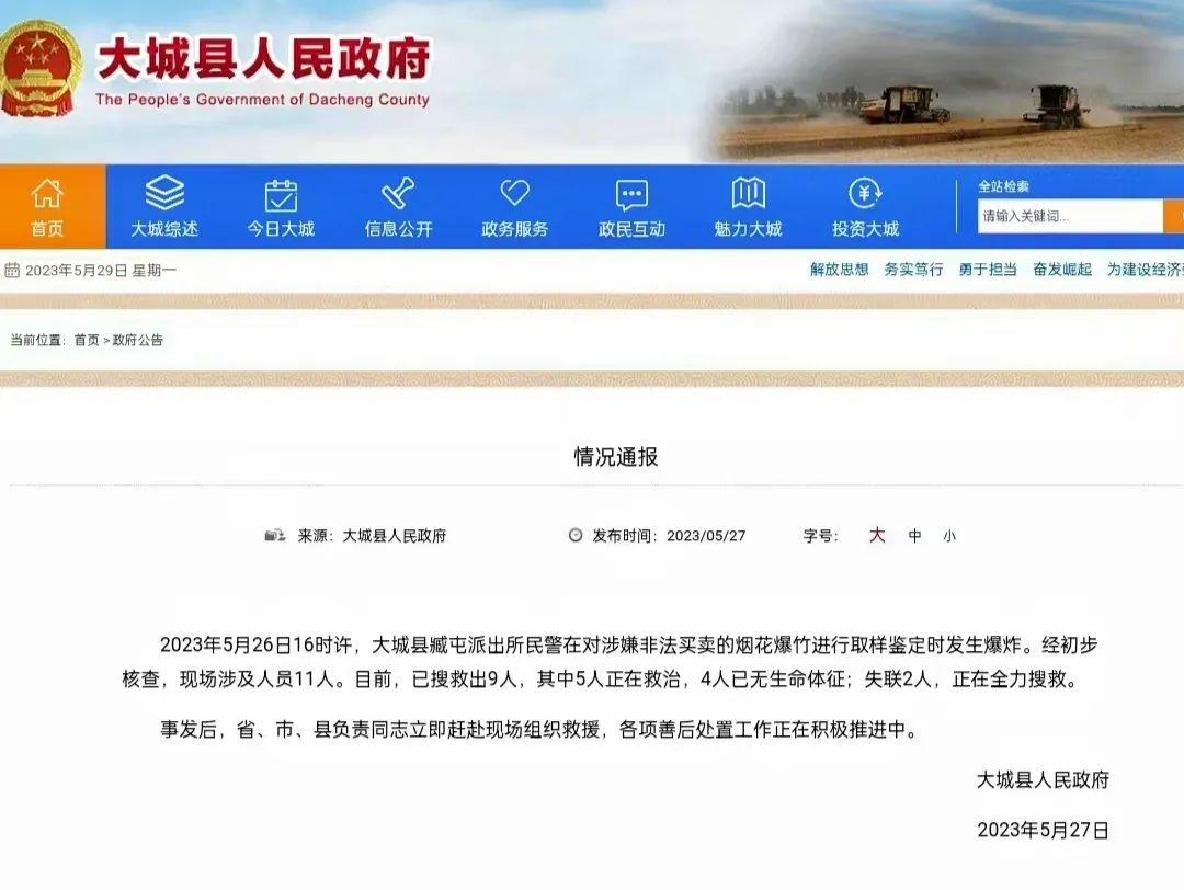 5月26日下午,網(wǎng)傳河北大城縣一派出所院內(nèi)發(fā)生爆炸,事故原因引發(fā)網(wǎng)民追問。5月27日8時許,大城縣人民政府網(wǎng)站通報稱:“5月26日16時許,大城縣臧屯派出所民警在對涉嫌非法買賣的煙花爆竹進(jìn)行取樣鑒定時發(fā)生爆炸。經(jīng)初步核查,現(xiàn)場涉及人員11人。其中,4人已無生命體征,失聯(lián)2人?!比欢▓笾刑峒暗谋ㄔ騾s成為后續(xù)輿情發(fā)酵點,網(wǎng)民不解派出所民警為何要去鑒定煙花爆竹,部分網(wǎng)民借機(jī)對死去民警進(jìn)行冷嘲熱諷,發(fā)布揣測性信息,并獲得其他網(wǎng)民點贊。面對這種局面,當(dāng)?shù)卣⑽催M(jìn)行回應(yīng)和解釋,認(rèn)證為“河北省公安廳政治部副主任”的賬號“@永華的小菜園”批評當(dāng)?shù)氐男畔l(fā)布“語焉不詳導(dǎo)致誤讀”。