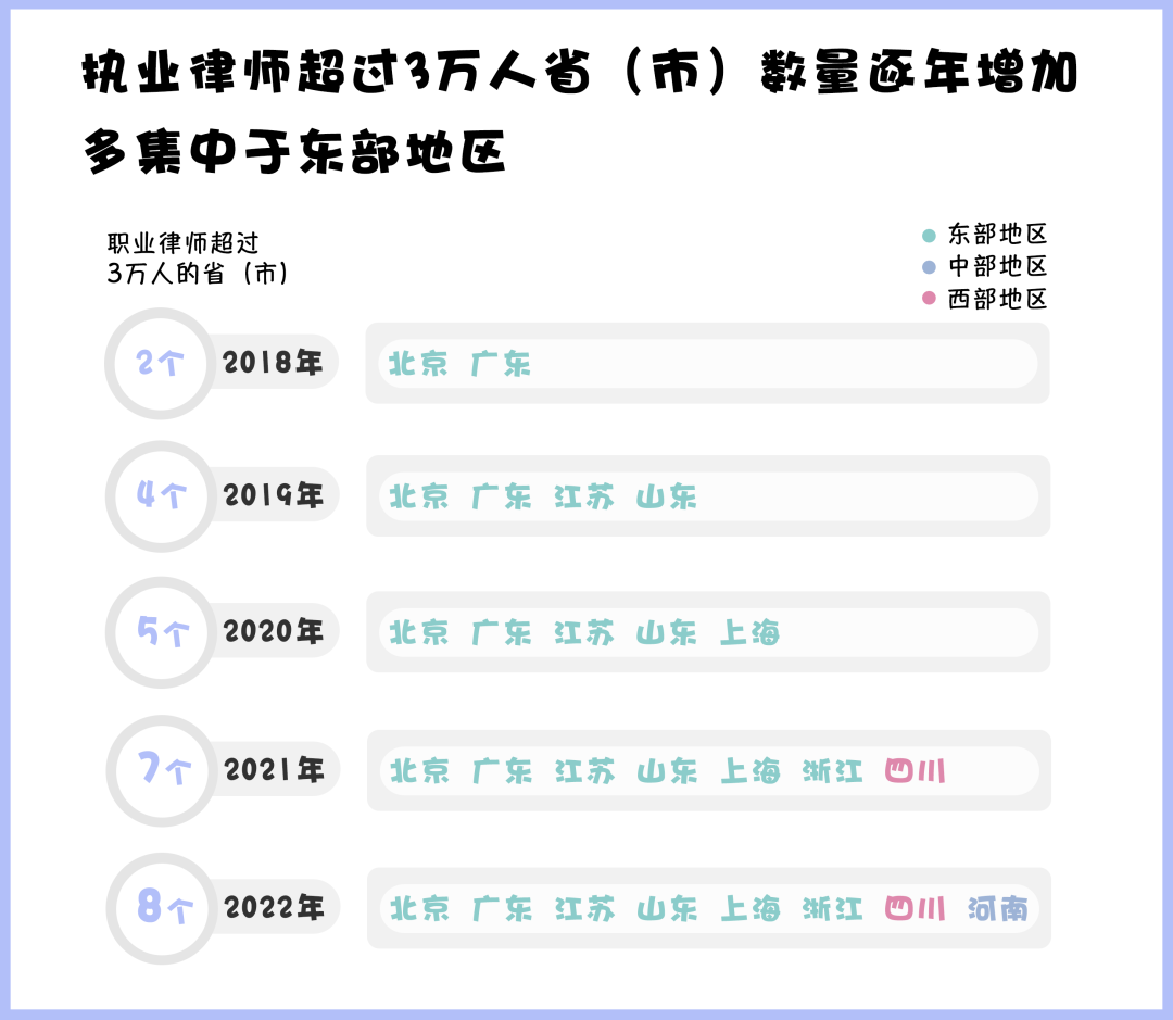 從司法部發(fā)布的數(shù)據(jù)來(lái)看,近五年來(lái),律師人數(shù)超過(guò)3萬(wàn)人的省(市)數(shù)量持續(xù)上漲,截至2022年底,共有8個(gè)?。ㄊ校┑穆蓭熑藬?shù)超過(guò)3萬(wàn),其中除河南、四川外,其余?。ㄊ校┚植荚跂|部地區(qū)。