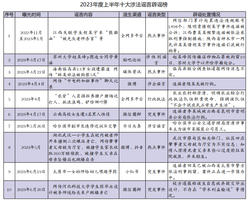 近年來,網(wǎng)絡(luò)謠言成為擾亂輿論秩序的一大頑疾,政法機(jī)關(guān)更是頻頻牽涉其中,亟需有效打擊。本研究匯總2023年上半年共242起網(wǎng)絡(luò)涉法謠言,從中總結(jié)出2023年上半年涉法網(wǎng)絡(luò)謠言特征,并圍繞謠言治理工作提出建議,供有關(guān)部門參考。