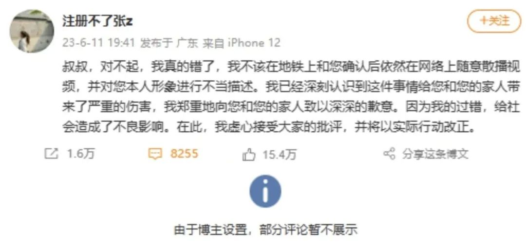 6月11日,被懷疑偷拍男子的兒子鄧某通過《南方都市報》發(fā)聲,稱父親是農(nóng)民工,當(dāng)天坐地鐵想在廣州轉(zhuǎn)轉(zhuǎn),未曾想到被當(dāng)做“猥瑣男”發(fā)到網(wǎng)上。他希望涉事女子公開道歉,否則將選擇起訴。該表態(tài)獲得大量網(wǎng)民支持。當(dāng)日,鄧某陪同父親到廣州鷺江站派出所報警,張某致歉,雙方再次達(dá)成和解。鄧某表示,她還是一名學(xué)生,公開道歉就好,不想影響她太多。當(dāng)日19時許,“@注冊不了張z”發(fā)博致歉,這條微博引發(fā)網(wǎng)民評論8000余條,但張某關(guān)閉了評論功能,僅顯示一條為其“站臺”的精選留言,很快有網(wǎng)民發(fā)現(xiàn)該賬號為張某小號。這一“操作”徹底激怒網(wǎng)民,有網(wǎng)民諷刺稱:“用專業(yè)優(yōu)勢帶風(fēng)向,發(fā)現(xiàn)‘失手’后先大號道歉,再小號帶節(jié)奏,不愧是傳媒學(xué)院的高材生?!比绯钡馁|(zhì)疑聲中,張某所在的四川大學(xué)也遭遇壓力,不斷有網(wǎng)民頻繁催促校方處置此事。6月12日,四川大學(xué)再次回應(yīng)稱仍在調(diào)查,但否認(rèn)網(wǎng)傳將要開除涉事女生的信息,輿情熱度持續(xù)走高,并于6月14日觸頂。