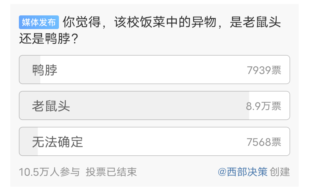 大量網(wǎng)民質(zhì)疑當(dāng)?shù)叵嚓P(guān)部門“指鼠為鴨”。據(jù)“@西部決策”發(fā)起的一項超10萬人參與的微博投票顯示,近九成網(wǎng)民認為食堂中的異物為“鼠頭”,不少科普博主、微博大V還有媒體均就此事發(fā)表評論,輿論場基調(diào)以追問和批評為主。6月6日上午,微博話題“#長牙的鴨脖令人如鯁在喉#”沖上熱搜榜第一位。另據(jù)《河南商報》報道,有網(wǎng)民爆料該校一教職工疑似要求學(xué)生針對此事進行“控評”。輿論場上,除了批評校方說謊、隱瞞等聲音之外,還有網(wǎng)民疑惑市場監(jiān)管部門為何替學(xué)?!罢九_”,猜測背后存在利益輸送等問題;也有網(wǎng)民拍攝視頻解釋稱,鴨脖在某個角度看起來很像老鼠頭;更多網(wǎng)民呼吁當(dāng)?shù)乇O(jiān)管部門拿出更多檢測證據(jù)來。