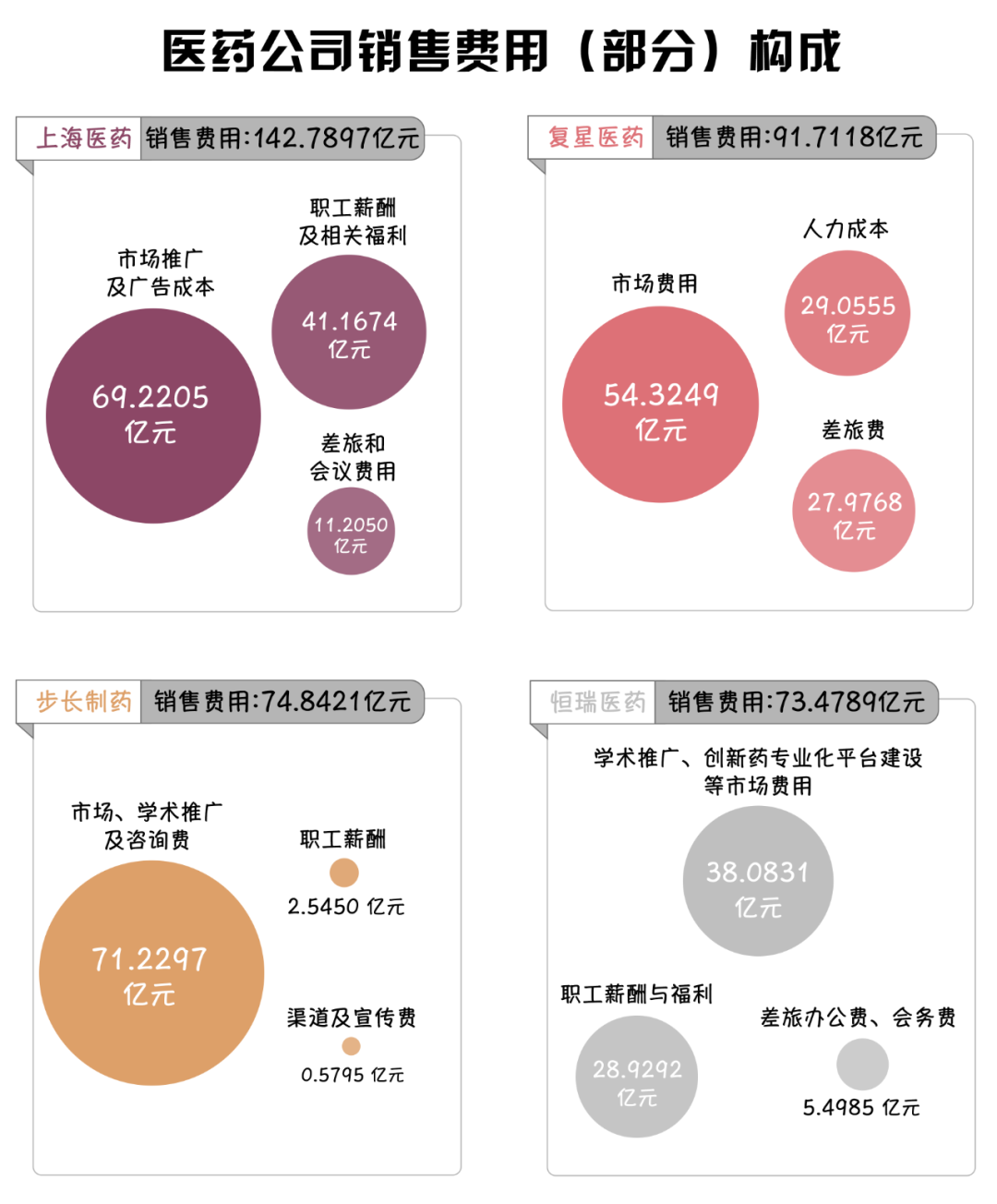 從藥企的銷(xiāo)售費(fèi)用構(gòu)成來(lái)看,分析2022年行業(yè)內(nèi)銷(xiāo)售費(fèi)用前4名的藥企可以看出,銷(xiāo)售費(fèi)用多用于市場(chǎng)、學(xué)術(shù)推廣、職工薪酬及福利。