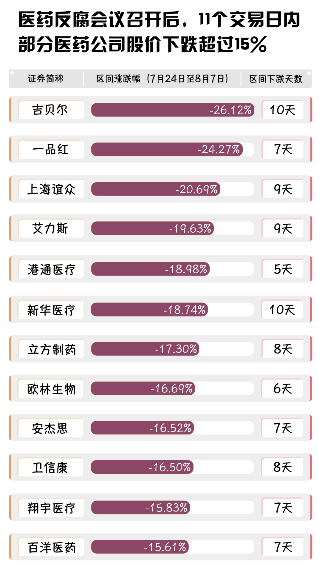 自7月21日,國(guó)家衛(wèi)健委聯(lián)合多部門(mén)召開(kāi)醫(yī)藥反腐整治會(huì)議后,藥企所受到的沖擊可從股市中窺探一二。根據(jù)wind(萬(wàn)得)發(fā)布的數(shù)據(jù)來(lái)看,從會(huì)后的第一個(gè)交易日(7月24日)以來(lái),11個(gè)交易日內(nèi),共有12家醫(yī)藥企業(yè)股價(jià)跌幅超過(guò)15%,其中11家藥企股價(jià)下跌天數(shù)在7天及以上。