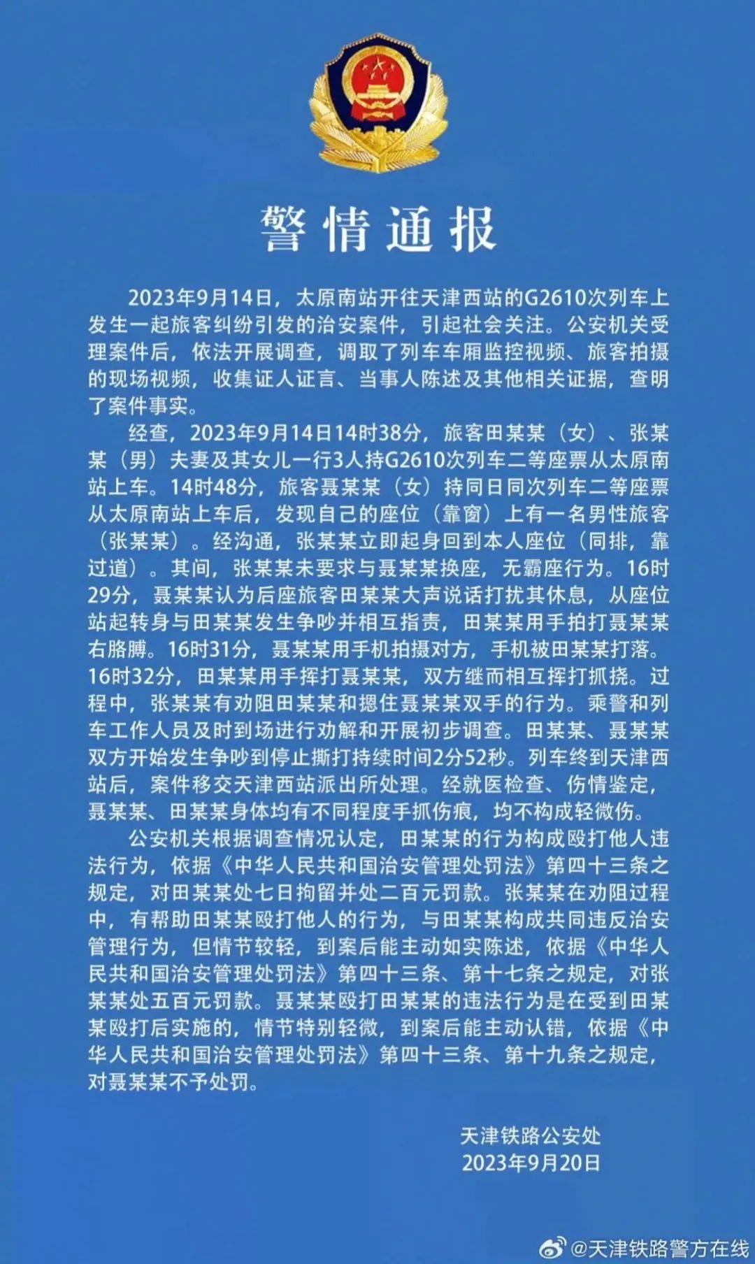 數(shù)日后,事件迎來(lái)動(dòng)態(tài)進(jìn)展。9月20日,天津鐵路公安處再次發(fā)布詳細(xì)通報(bào),還原了事發(fā)過程,表示雙方矛盾系因口角糾紛引發(fā),不存在霸座行為,雙方均不構(gòu)成輕微傷,田某某有毆打他人違法行為,將其拘留七日并罰款200元,張某某勸阻過程中幫助田某某毆打他人,被處以500元罰款,聶某某的毆打行為是在受到田某某毆打后實(shí)施的,因情節(jié)特別輕微且主動(dòng)認(rèn)錯(cuò)不予處罰。網(wǎng)民認(rèn)可通報(bào)內(nèi)容,稱“原來(lái)如此”,贊官方處理得當(dāng)。