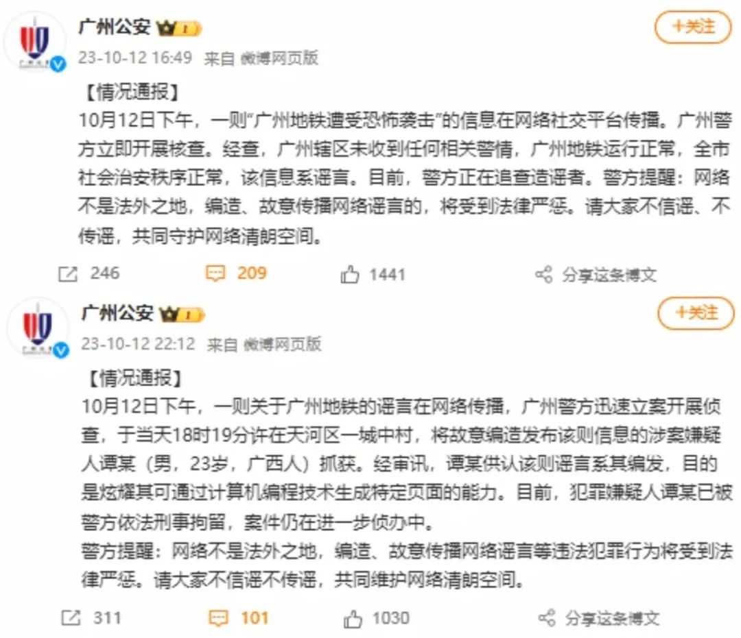 【典型案例】10月12日下午,一則“廣州地鐵遭受恐怖襲擊”的信息在網(wǎng)絡(luò)社交平臺傳播。此則消息以截圖的形式被傳播,圖片顯示作者為“廣州市公安局”,內(nèi)容稱“10月12日下午14時,廣州市地鐵3號線珠江新城站,3名恐怖分子攜帶TNT炸藥在地鐵搶劫,走火發(fā)生意外,產(chǎn)生劇烈爆炸,造成多方傷亡”。當(dāng)日16時49分,官方微博“@廣州公安”發(fā)布通報進(jìn)行辟謠。同日22時12分,“@廣州公安”再次發(fā)布通報稱,當(dāng)天18時19分許在天河區(qū)一城中村,警方將故意編造發(fā)布該則信息的涉案嫌疑人譚某抓獲。經(jīng)審訊,譚某供認(rèn)該則謠言系其編發(fā),目的是炫耀其可通過計算機編程技術(shù)生成特定頁面的能力。