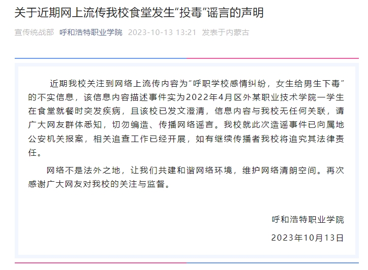 【典型案例】自10月初,連續(xù)有網(wǎng)民在社交媒體發(fā)視頻稱,呼和浩特職業(yè)學(xué)院發(fā)生悲劇,一名男生因感情糾紛被女生下毒致死,引發(fā)社會關(guān)注。10月13日,該校發(fā)布了一份聲明,澄清這條信息不實,與學(xué)校無任何關(guān)聯(lián)。據(jù)悉,網(wǎng)絡(luò)流傳的視頻中描述的事件實為2022年4月江蘇南京交通職業(yè)技術(shù)學(xué)院一學(xué)生在食堂就餐時突發(fā)疾病 ,并非因為女生下毒。而且,江蘇南京交通職業(yè)技術(shù)學(xué)院在當(dāng)時就已經(jīng)發(fā)布了相關(guān)澄清。再如,10月18日,網(wǎng)傳江蘇南京有男子在酒吧外性侵一名醉酒女子。當(dāng)日,事發(fā)地所屬南京市警方相關(guān)工作人員回應(yīng)稱,警方已查清此事,沒有性侵,網(wǎng)傳情況有夸大成分。另據(jù)警方透露,某社交網(wǎng)站流傳的不實消息,“是專門的AI軟件寫的”。