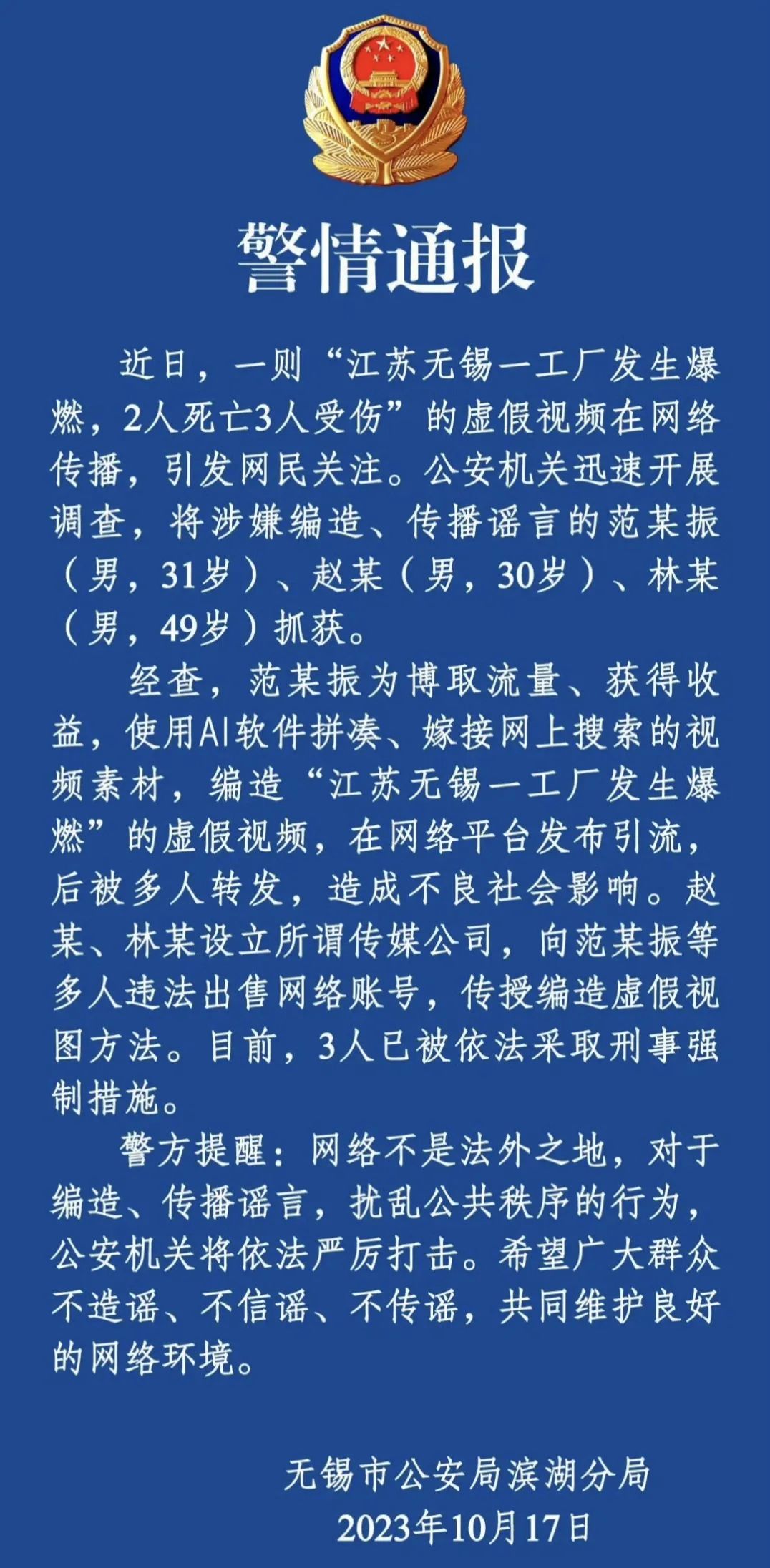 【典型案例】10月17日,一則“江蘇無錫一工廠發(fā)生爆燃,2人死亡3人受傷”的虛假視頻在網(wǎng)絡(luò)傳播,引發(fā)網(wǎng)民關(guān)注。當(dāng)日20時許,無錫市公安局濱湖分局微信公眾號“濱湖警事”發(fā)布警情通報,稱此為一起謠言事件,已經(jīng)將造謠、傳謠的范某、趙某、林某三人抓獲。經(jīng)查,范某為博取流量、獲得收益,使用AI軟件拼湊、嫁接網(wǎng)上搜索的視頻素材,編造相關(guān)虛假視頻,在網(wǎng)絡(luò)平臺發(fā)布引流,后被多人轉(zhuǎn)發(fā),造成不良社會影響。趙某、林某設(shè)立所謂傳媒公司,向范某等多人違法出售網(wǎng)絡(luò)賬號,傳授編造虛假視圖方法。
