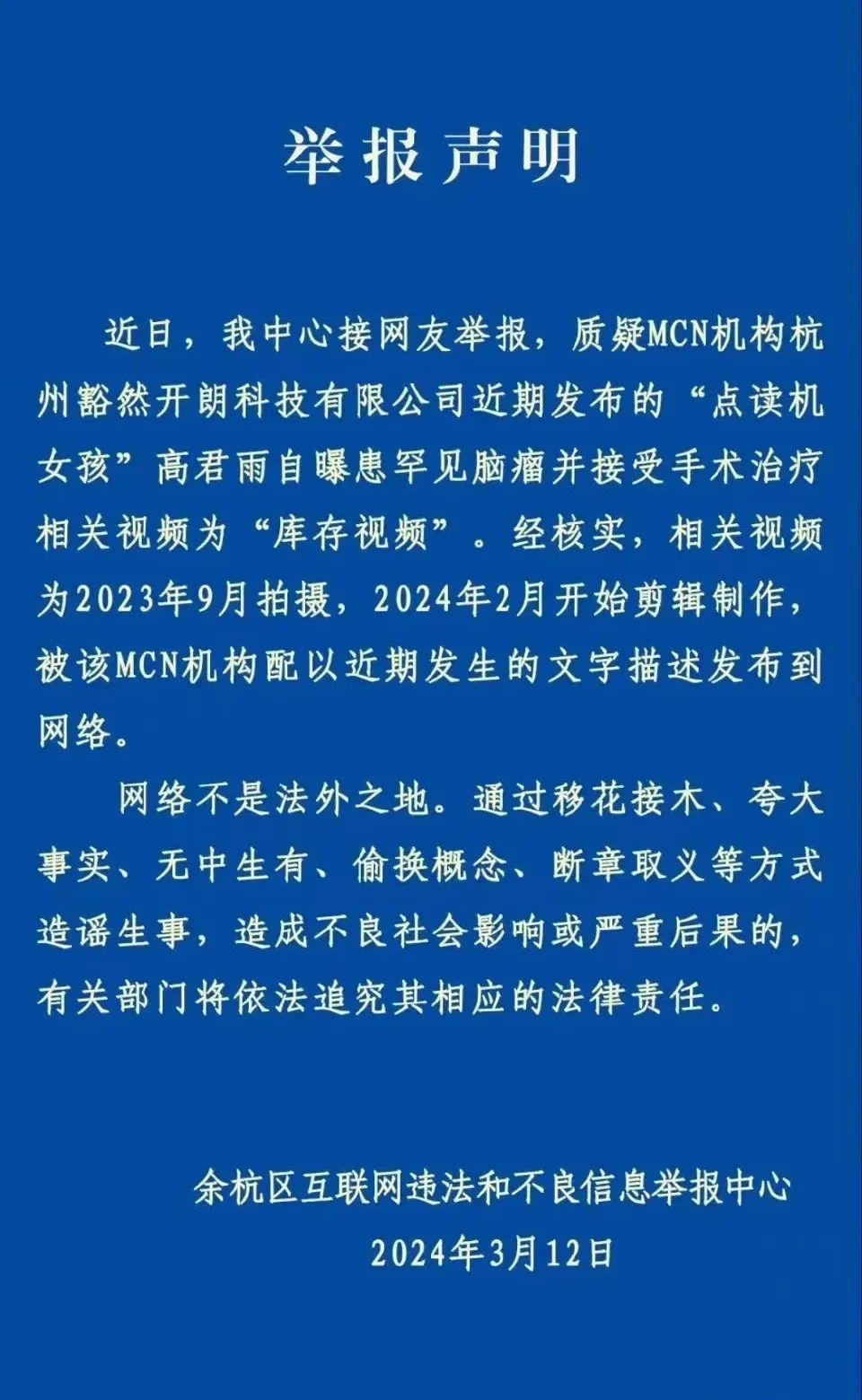 3月12日,涉事MCN機構杭州豁然開朗科技有限公司發(fā)布致歉聲明稱,文案的時間表述出現(xiàn)嚴重紕漏,從未進行過捐款、打賞等盈利性操作。網(wǎng)民對此說法并不認可,事件持續(xù)發(fā)酵。當日,杭州市余杭區(qū)互聯(lián)網(wǎng)違法和不良信息舉報中心通報稱,經(jīng)核實,相關視頻為2023年9月拍攝,2024年2月開始剪輯制作,被MCN機構配以近期發(fā)生的文字描述發(fā)布到網(wǎng)絡,有關部門將依法追究其法律責任。另據(jù)潮新聞報道,涉事MCN機構負責人正在接受調(diào)查。