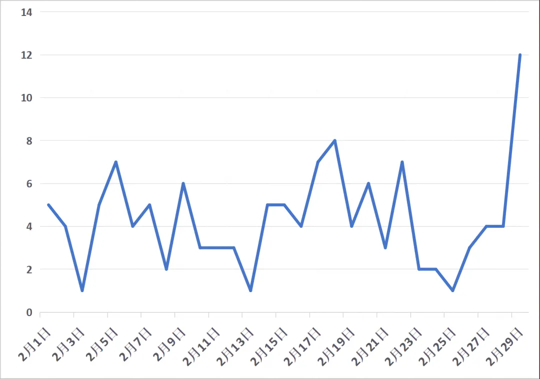 2024年2月,法治網(wǎng)輿情中心共監(jiān)測到熱點事件123起。從類型分布上看,企業(yè)相關熱點事件最多發(fā),占比約25%;社會新聞次之,占比近19%;突發(fā)事故及案事件總體熱度較高。從時間分布上看,2月29日發(fā)生的熱點事件最多,達12起。熱度最高的事件為“2024年央視春晚”,其次為多部春節(jié)檔電影上映引發(fā)熱議、武漢凍雨、OpenAI推出人工智能視頻生成模型“Sora”等事件。整體上看,2月并未出現(xiàn)高熱度、高烈度的負面輿情事件,輿論場平穩(wěn)有序。