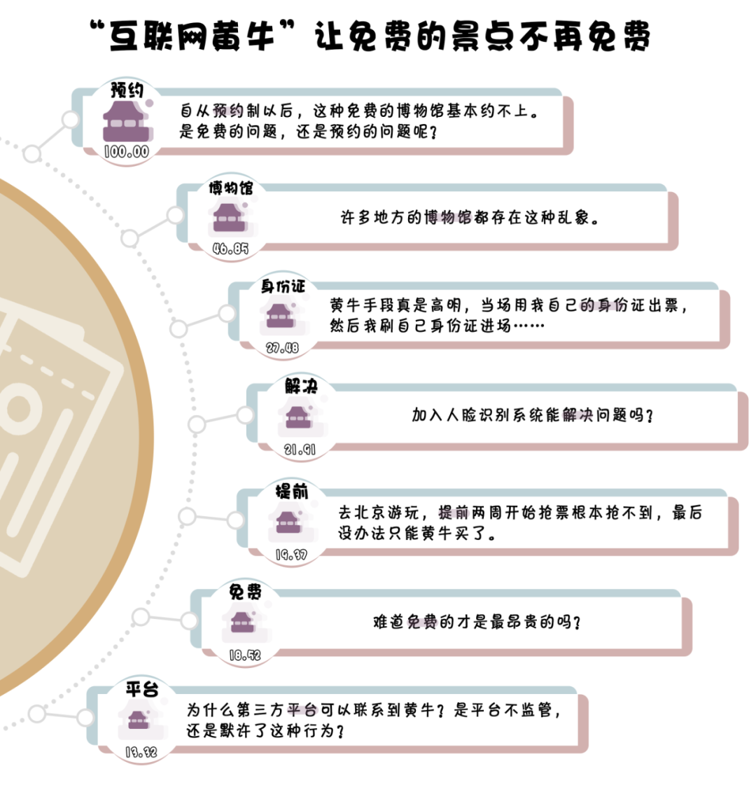 如此“作弊”手段引發(fā)輿論熱議。有網(wǎng)民表示,多地免費(fèi)景點(diǎn)都存在預(yù)約不上的現(xiàn)象,想去游玩必須花錢,其中博物館成“重災(zāi)區(qū)”;有網(wǎng)民感嘆“互聯(lián)網(wǎng)黃?!笔侄沃呙髁钊瞬坏貌环?,其已經(jīng)默許了“互聯(lián)網(wǎng)黃牛”現(xiàn)象;部分網(wǎng)民反映,某些第三方平臺上,免費(fèi)預(yù)約門票被裹上“講解服務(wù)”“研學(xué)套餐”等外衣,搖身一變成為貨架上的商品,不禁令人發(fā)問,“互聯(lián)網(wǎng)黃?!睘楹慰梢悦髂繌埬懙卦诘谌狡脚_上售賣免費(fèi)預(yù)約門票?是官方平臺監(jiān)管不力、置之不理,還是其授意“互聯(lián)網(wǎng)黃?!迸c第三方平臺相互串通謀取利益?