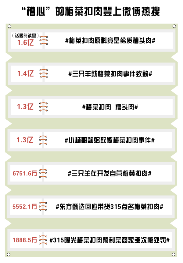 在引發(fā)行業(yè)震蕩后,該事件的影響從預(yù)制菜領(lǐng)域蔓延到直播帶貨領(lǐng)域,原因是東方甄選、主播“瘋狂小楊哥”以及其所屬的三只羊網(wǎng)絡(luò)科技有限公司均在直播間售賣過(guò)該產(chǎn)品。消息一出,輿論嘩然。對(duì)此,東方甄選、主播“瘋狂小楊哥”、三只羊網(wǎng)絡(luò)均作出回應(yīng)并致歉。從相關(guān)微博話題來(lái)看,“#梅菜扣肉原料竟是糟頭肉#”“#三只羊就梅菜扣肉事件致歉#”“#小楊哥鞠躬致歉梅菜扣肉事件#”等話題閱讀量均超過(guò)1.3億,輿論聲量頗高。