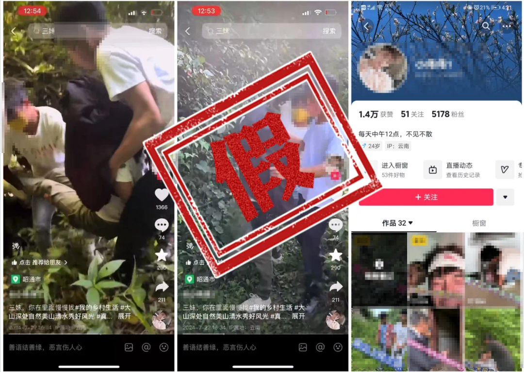 “婆媳勢(shì)不兩立”“婚姻一地雞毛”等以家庭矛盾為中心、以沖突為賣(mài)點(diǎn)的網(wǎng)絡(luò)虛假擺拍視頻并不鮮見(jiàn),此類(lèi)視頻往往密集制造沖突,放大家庭矛盾,且臺(tái)詞夸張、情節(jié)曲折。8月28日,抖音發(fā)布近期介入核實(shí)的網(wǎng)絡(luò)虛假擺拍典型案例,博主“是老王家的二姐呀”自稱(chēng)在14歲至20歲期間被父母包辦3次婚姻,16歲時(shí)就和“大自己30歲的男子”生下兒子,并與幾個(gè)自稱(chēng)“三妹”“大姐”的賬號(hào)互動(dòng)頻繁,以矩陣賬號(hào)合力擺拍造假。涉事賬號(hào)被平臺(tái)采取封禁處理。10月,貴州畢節(jié)市七星關(guān)區(qū)網(wǎng)警與山東青島市網(wǎng)警先后通報(bào)“外來(lái)媳婦遭嫌棄毆打趕出家門(mén)后,躲進(jìn)山洞艱苦求生”“臨盆孕婦被丈夫遺棄荒山數(shù)日,孤立無(wú)援,無(wú)法下山求救”兩起虛假擺拍案例,相關(guān)涉案人員均被當(dāng)?shù)鼐浇o予行政處罰。