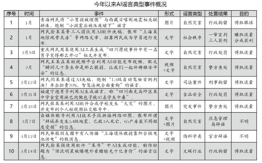 10起典型案例中,有4起AI謠言與自然災(zāi)害相關(guān),包括地震、山體滑坡等;2起謠言涉及食品安全和突發(fā)事件,分別為“四川某中學(xué)食堂用淋巴肉做包子致87名學(xué)生中毒”和“某地學(xué)校發(fā)生火災(zāi)”;還有4起謠言分別涉及偽科學(xué)、文娛行業(yè)、社會(huì)秩序和司法案件四個(gè)方面。AI謠言表現(xiàn)形式較多,大多通過微博、微信、短視頻等社交媒體渠道擴(kuò)散,并以文字、圖片、視頻形式單一或“搭配”傳播,比如“西藏定日縣地震一小孩被壓廢墟”謠言形式為圖片,“上海退休教授靠陽(yáng)臺(tái)核電池供電”謠言則是以“文字+視頻”的形式傳播。造謠動(dòng)機(jī)方面,有8起事件明確提到造謠者是為了蹭熱點(diǎn)、賺取流量收益,可見流量經(jīng)濟(jì)仍然是AI謠言存在的底層邏輯。10起事件中,有2起事件被官方辟謠,但沒有其他情況通報(bào),其余8起均有明確處理結(jié)果。處置結(jié)果方面,10起事件中有5起事件的造謠者被公安機(jī)關(guān)給予行政處罰或行政拘留,有2起事件進(jìn)入到司法流程,網(wǎng)民閆某某因刻意炒作“國(guó)內(nèi)首例智能駕駛致死案”,被屬地警方刑事拘留;網(wǎng)民徐某某等3人散布“上海某地驚現(xiàn)骨灰房”等謠言,獲利數(shù)額較大,被上海當(dāng)?shù)胤ㄔ阂苑欠ń?jīng)營(yíng)罪判處有期徒刑一年十個(gè)月不等。