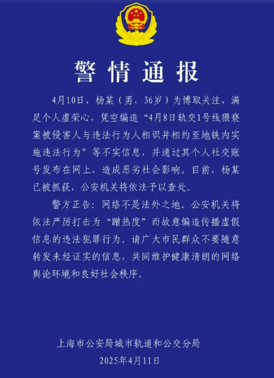 4月11日9時29分,“@軌交幺幺零”再發(fā)通報稱,男子楊某為博取關(guān)注,憑空編造“軌交1號線猥褻案男女雙方相識”謠言,發(fā)布到網(wǎng)上后造成惡劣影響,目前已被抓獲。官方通報再掀一波討論熱潮,微博轉(zhuǎn)評2萬余次、點(diǎn)贊超26萬次,“進(jìn)去得好”“還是官方速度快”等評論獲得網(wǎng)民點(diǎn)贊認(rèn)同。紅星新聞、極目新聞等媒體發(fā)文稱,“造黃謠和性騷擾都該人人喊打”;部分網(wǎng)民言論涉及性別對立話題,如“出手相助的是女的,猥褻造謠的都是男的”。截至4月17日12時,該事件相關(guān)輿情信息量超8萬條,“#上海地鐵一男子疑脫褲猥褻女乘客#”“#上海辟謠地鐵猥褻事件當(dāng)事人相識#”等數(shù)十個關(guān)聯(lián)微話題累計閱讀量超6億。