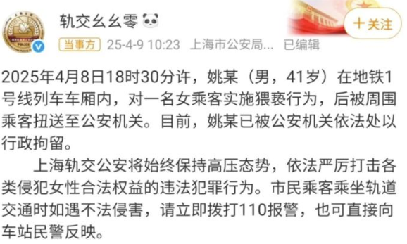 4月9日上午,多段網(wǎng)傳視頻引發(fā)關(guān)注,視頻顯示,上海地鐵一名女乘客疑似被猥褻,對身邊男子哭喊道“你把褲子脫了并弄到我身上”,同車女子稱“姐妹,我錄了視頻,我陪你去”?!癅荔枝新聞”等媒體跟進(jìn)報道,上海地鐵客服工作人員稱確有其事,網(wǎng)民痛斥男子“變態(tài)”“垃圾”。當(dāng)日10時23分,上海市公安局城市軌道和公交分局官微“@軌交幺幺零”發(fā)通報稱,“4月8日18時30分許,姚某在地鐵1號線列車車廂內(nèi),對一名女乘客實(shí)施猥褻行為,被周圍乘客扭送至公安機(jī)關(guān)。目前,姚某已被公安機(jī)關(guān)依法處以行政拘留”。多數(shù)網(wǎng)民稱贊警方行動快速;部分網(wǎng)民表示不滿,認(rèn)為行政拘留處罰較輕。4月10日,男子所在的工作單位發(fā)布公告,宣布將其開除。