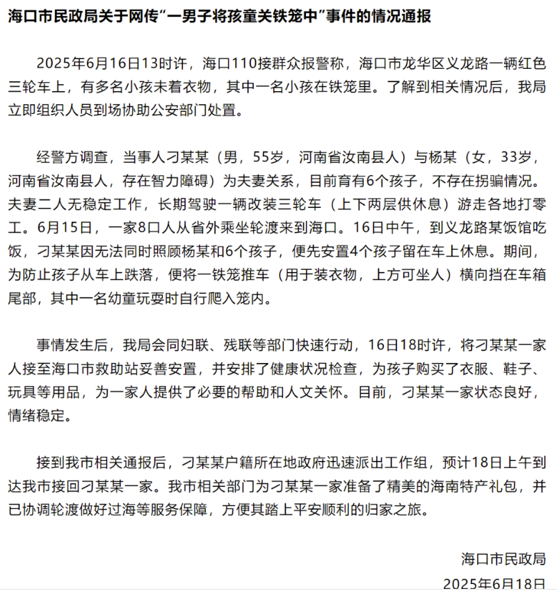 6月18日凌晨,據(jù)微信公眾號(hào)“??诎l(fā)布”消息,??谑忻裾滞▓?bào)稱,河南汝南縣人刁某某與有智力障礙的妻子楊某育有6子,無(wú)拐騙;夫妻二人無(wú)穩(wěn)定工作,長(zhǎng)期駕駛一輛改裝三輪車游走各地打零工;因無(wú)力看管,刁某某把鐵籠擋在車尾防跌落,幼童玩耍時(shí)自行爬入。刁某某一家人已被接至救助站安置,18日將被戶籍地政府工作組接回。另?yè)?jù)福建電視臺(tái)“第一幫幫團(tuán)”欄目消息,汝南縣婦聯(lián)回應(yīng)稱,雙方已結(jié)婚多年,各部門(mén)正在協(xié)調(diào)制定方案,會(huì)對(duì)孩子幫扶。官方的積極回應(yīng)和作為緩和網(wǎng)民情緒,輿論關(guān)注轉(zhuǎn)到未成年人權(quán)益保障方面,湖北經(jīng)視《經(jīng)視直播》欄目關(guān)注孩童的受教育權(quán)、生命健康權(quán)是否得到保障,認(rèn)為當(dāng)?shù)夭块T(mén)有必要介入評(píng)估這對(duì)父母是否具有撫育能力,視情干預(yù);部分網(wǎng)民希望地方政府完善救助體系,保障幼童合法權(quán)益。截至6月26日12時(shí),相關(guān)信息5.2萬(wàn)余條,“#海口多名赤裸幼童被父親關(guān)車斗鐵籠#”等微博話題閱讀量累計(jì)超1.1億。