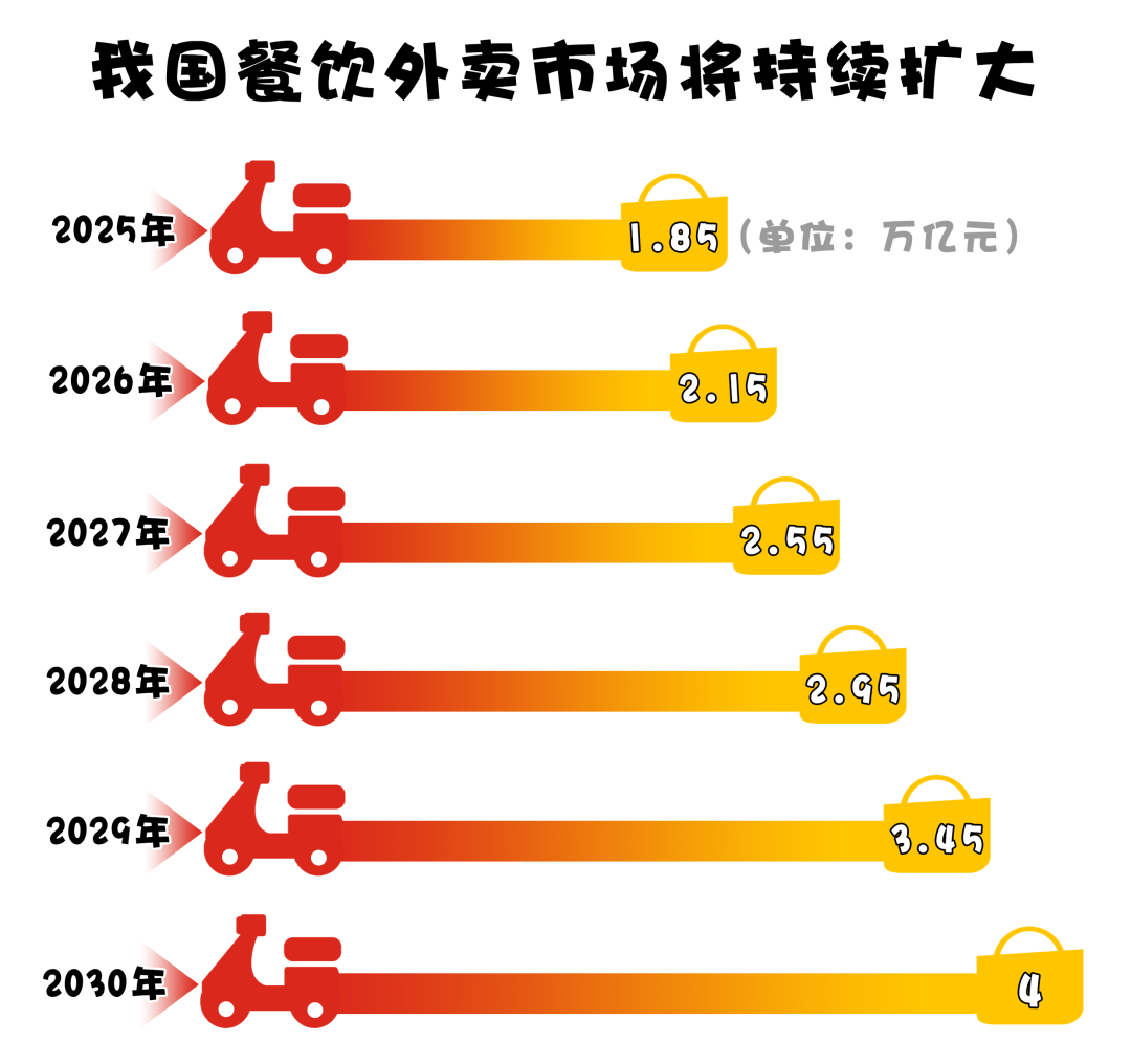 以外賣市場中的餐飲業(yè)為例,數據顯示,未來幾年,預計我國餐飲外賣市場規(guī)模將顯著增長,將從2025年的1.85萬億元一路攀升至2030年的4萬億元。這一持續(xù)拓寬的商業(yè)藍海,引得各家外賣平臺摩拳擦掌,“外賣大戰(zhàn)”不時打響。