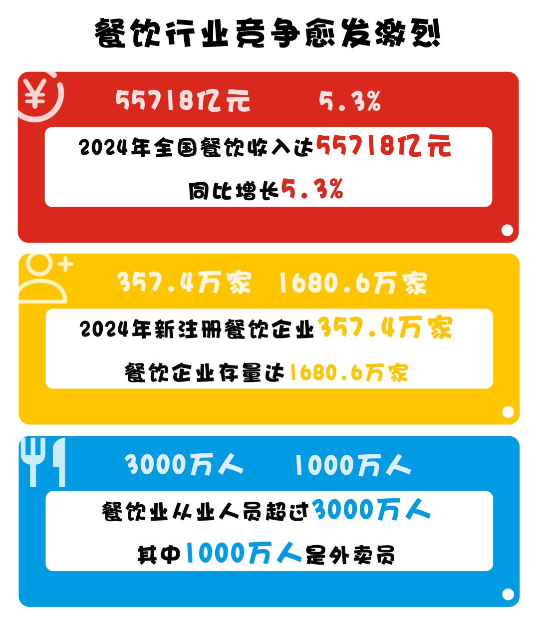 餐飲行業(yè)競爭激烈。數據顯示,截至2024年,我國餐飲企業(yè)數量已突破1680萬家,餐飲業(yè)從業(yè)人員超3000萬人,其中超1000萬人為外賣員。在此背景下,與外賣平臺合作成為不少商家順應時代、立足行業(yè)的重要選擇。