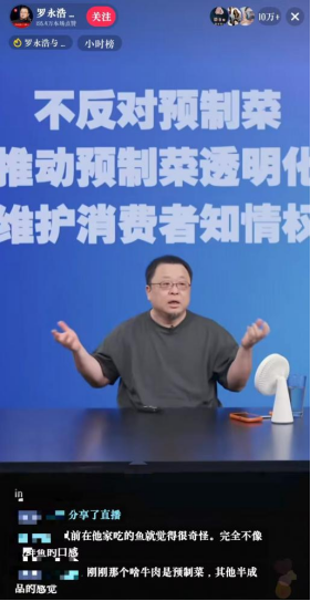 9月12日晚間,羅永浩在多平臺同步直播,開播僅10分鐘其抖音直播間觀看人數(shù)已超10萬。羅永浩在直播中以西貝使用的“凍海鱸魚”舉例,認(rèn)為食用這種經(jīng)過深度工業(yè)化處理的食材與大眾去餐廳追求新鮮的初衷顯然不符,且稱西貝“是所有賣預(yù)制菜餐廳里賣最貴的”。羅永浩強調(diào),預(yù)制菜還沒有正式的國家標(biāo)準(zhǔn),不反對預(yù)制菜,而是主張“推動中國預(yù)制菜行業(yè)透明化、保障消費者的知情權(quán)”,并點贊了餐飲品牌老鄉(xiāng)雞公示菜品區(qū)分“現(xiàn)做”“半預(yù)制”“預(yù)制”加工等級的舉措。
