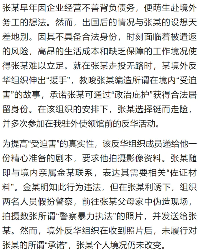 4. “境外反華組織教唆擺拍暴力執(zhí)法” 案。8月14日,國家安全部公布一起標(biāo)題為《跨境賣慘終成空》的案例。據(jù)悉,張某國內(nèi)企業(yè)經(jīng)營不善負(fù)債,赴境外務(wù)工后因無合法身份面臨遣返風(fēng)險。境外反華組織以“政治庇護(hù)換取居留身份”為誘餌,提供詳細(xì)拍攝劇本,還提出“畫面暴力血腥”“效果要慘”“抓拍增強(qiáng)真實感”等要求。在反華組織教唆下,張某聯(lián)系到親屬金某,金某明知此行為違法,但在張某利誘下組織兩名人員假扮警察,前往張某父母家中偽造現(xiàn)場,拍攝數(shù)張所謂“警察暴力執(zhí)法”的照片,并將材料發(fā)送境外,但境外反華組織在收到照片后未履行對張某的所謂“承諾”。該案最終被國家安全機(jī)關(guān)破獲。央視網(wǎng)、微信公眾號“俠客島”等轉(zhuǎn)發(fā)相關(guān)內(nèi)容。輿論將此案稱為一場“政治避難”鬧劇,指出“因一己之利參加境外反華活動,為反華勢力提供煽宣‘彈藥’,但最終竹籃打水一場空”。