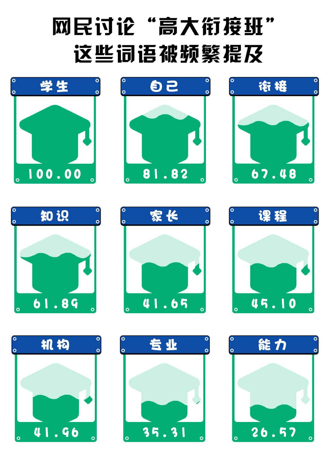 (數(shù)據(jù)來源:選取知乎話題“培訓(xùn)機(jī)構(gòu)推出‘高大銜接班’,為大一新生補(bǔ)習(xí)大學(xué)知識,暑假補(bǔ)課真能‘贏在大學(xué)起跑線’嗎?”下的172個回答,做分詞及歸一化處理,進(jìn)行分詞后將熱度最高的詞語規(guī)定為100)