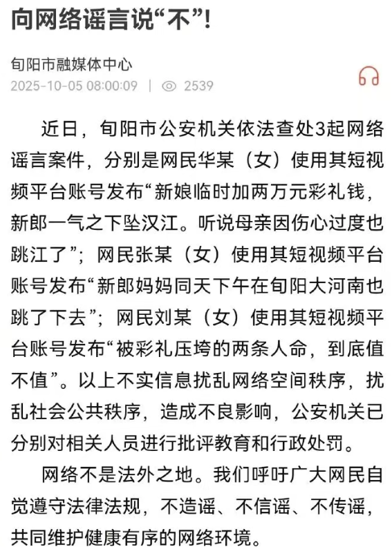 10月5日,旬陽市融媒體中心發(fā)布消息稱,近日,旬陽市公安機(jī)關(guān)依法查處3起網(wǎng)絡(luò)謠言案件,三名網(wǎng)民使用短視頻平臺賬號發(fā)布“新郎婚禮前跳河”事件不實(shí)信息,擾亂網(wǎng)絡(luò)空間秩序和社會公共秩序,造成不良影響,公安機(jī)關(guān)已分別對相關(guān)人員進(jìn)行批評教育和行政處罰。隨后,中國新聞社、觀察者網(wǎng)、《法治日報(bào)》等媒體轉(zhuǎn)發(fā)報(bào)道。此次回應(yīng)雖引發(fā)了輿論對網(wǎng)絡(luò)謠言的深思,但仍未能驅(qū)散公眾心頭的疑云。紅網(wǎng)評論道,官方調(diào)查需要時間,而信息真空期恰恰為謠言的滋生提供了土壤。紅星新聞評論認(rèn)為,無論原因?yàn)楹?,都令人痛心。此時,理性的圍觀和善意的等待,遠(yuǎn)比迫不及待的“斷案”更有價(jià)值。我們應(yīng)該給予足夠的尊重和空間,等待權(quán)威的、詳盡的調(diào)查結(jié)果。《新京報(bào)》評論指出,這起新郎跳河事件具備足夠的公共性,有必要把事件的前因后果說得更清楚明白一些。否則,各種傳言甚至謠言紛紛而起,不利于網(wǎng)絡(luò)空間和社會秩序的維護(hù)。多數(shù)網(wǎng)民也持相同觀點(diǎn),認(rèn)為“掩蓋必然引發(fā)猜測”,并持續(xù)追問事件真相,呼吁官方給出更具說服力的詳實(shí)通報(bào)。