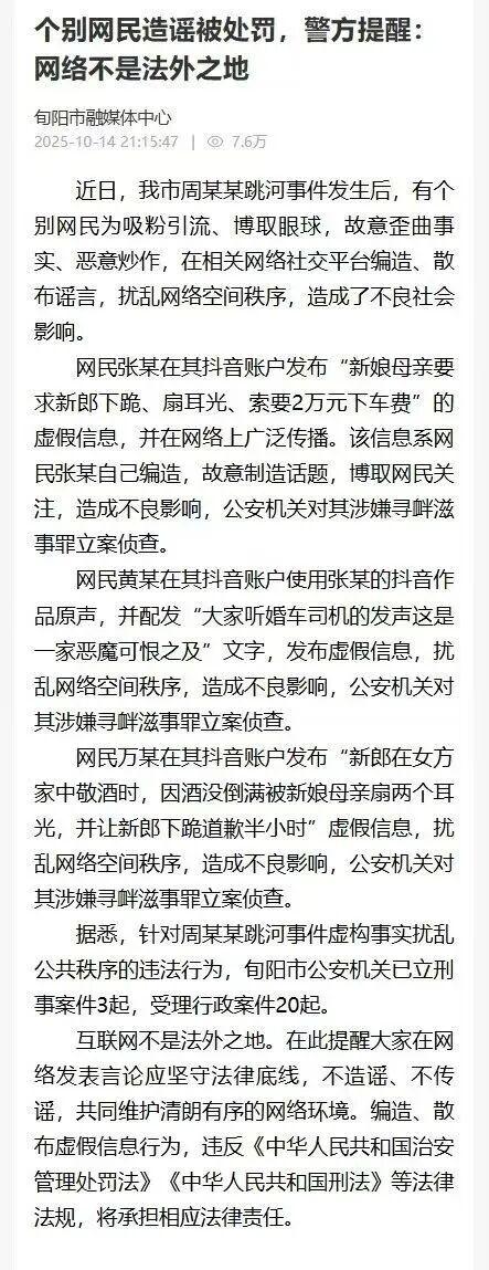 同日,陜西安康旬陽市融媒體中心發(fā)布消息稱,近日,旬陽市周某某跳河事件發(fā)生后,有個別網(wǎng)民為吸粉引流、博取眼球,故意歪曲事實(shí)、惡意炒作,在相關(guān)網(wǎng)絡(luò)社交平臺編造、散布謠言,擾亂網(wǎng)絡(luò)空間秩序,造成了不良社會影響。網(wǎng)民張某、黃某、萬某在短視頻賬戶發(fā)布相關(guān)虛假信息,造成不良影響,已被公安機(jī)關(guān)以涉嫌尋釁滋事罪立案偵查。針對周某某跳河事件虛構(gòu)事實(shí)擾亂公共秩序的違法行為,旬陽市公安機(jī)關(guān)已立刑事案件3起,受理行政案件20起。輿論普遍表示,官方展現(xiàn)了治理謠言的決心,認(rèn)為制止謠言最好的方法就是公布調(diào)查結(jié)果。