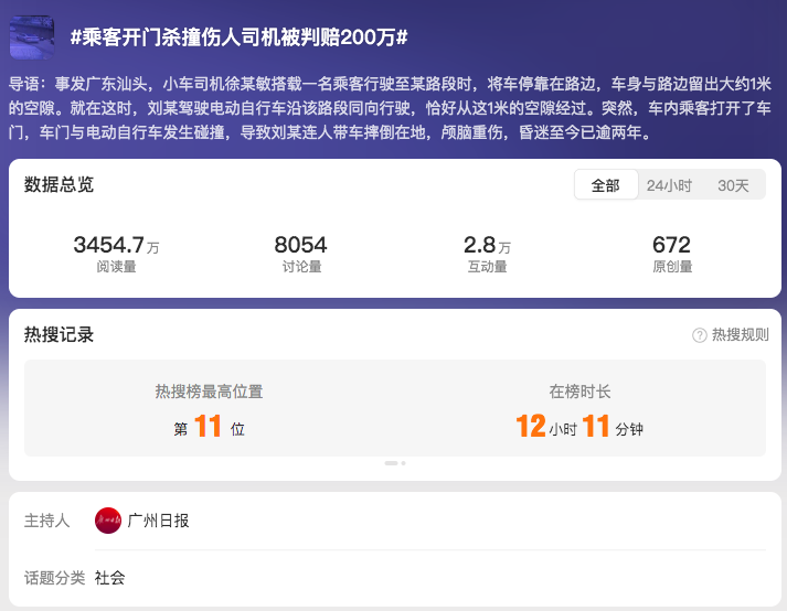 此案被報(bào)道后,環(huán)球網(wǎng)、上觀新聞、《廣州日報(bào)》等媒體接力傳播,推高輿情熱度,微博話題“#乘客開門殺撞傷人司機(jī)被判賠200萬#”登上熱搜榜第11位。