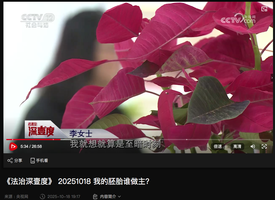 10月18日,央視社會與法頻道《法治深壹度》節(jié)目播發(fā)專題報道《我的胚胎誰做主?》,報道一起喪偶婦女輔助生殖權(quán)益案。據(jù)介紹,福建李女士在丈夫不幸去世后,希望利用夫妻二人在醫(yī)院冷凍保存的胚胎繼續(xù)實施移植手術(shù),但醫(yī)院鑒于醫(yī)學(xué)倫理問題拒絕了她的請求。隨后李女士將醫(yī)院起訴至法院,一審和二審均被駁回。直至2022年6月,福建省高級人民法院再審認(rèn)為,李女士要求醫(yī)院為其實施胚胎移植手術(shù)生育二胎有充分的法律依據(jù),并且還能在精神上撫慰雙方的老人,最終判決醫(yī)院繼續(xù)履行合同,為李女士實施胚胎移植手術(shù)。該報道采訪到李女士本人、醫(yī)院代理律師、法學(xué)專家及法官,全面回顧李女士個人遭遇、情感動機(jī)以及案件背后的法理爭議。