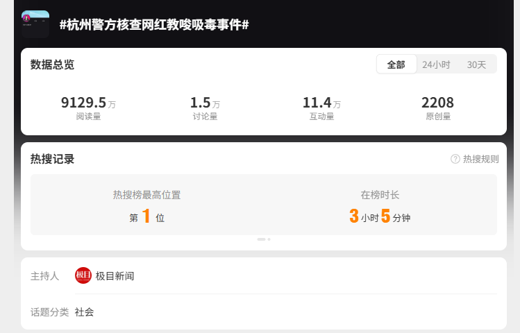 截至11月9日20時,相關(guān)信息量2.5萬余條,微博話題“#杭州警方核查網(wǎng)紅教唆吸毒事件#”“#800萬粉絲網(wǎng)紅被控訴教唆他人吸毒#”“#被控教唆吸毒800萬粉絲網(wǎng)紅被封號#”等閱讀量累計超1.5億。