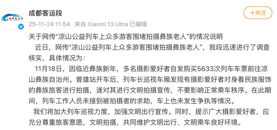 11月24日12時許,“@成都客運段”發(fā)布情況說明稱,因臨近彝族新年,近日多名攝影愛好者乘坐5633次列車前往涼山彝族自治州。普雄站開車后,列車長巡視車廂發(fā)現(xiàn)有攝影愛好者對身著民族服飾的彝族旅客進行拍攝,遂對其進行文明拍攝宣傳,不要影響正常乘車秩序。在此期間,列車工作人員未接到被拍攝者的求助,車上也未發(fā)生爭執(zhí)等情況。今后將加大列車巡視力度,加強文明出行宣傳。