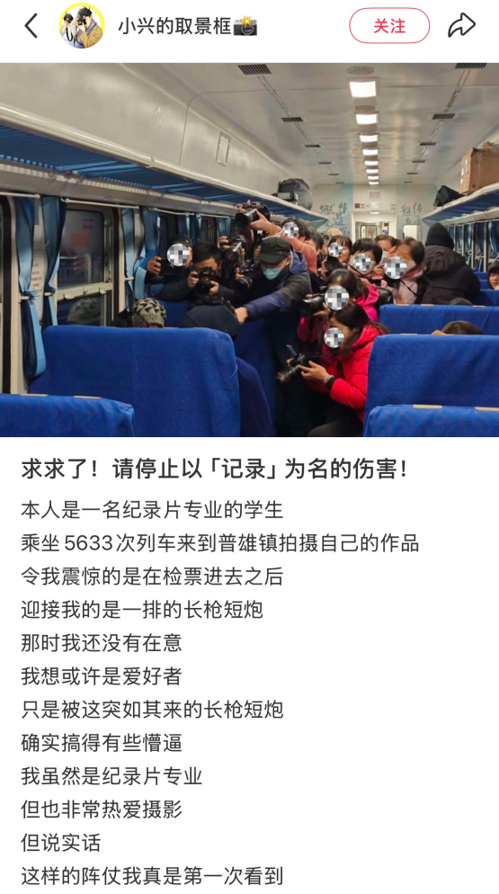 11月19日20時許,小紅書網(wǎng)民“@小興的取景框”發(fā)帖稱,自己在乘坐5633次列車前往普雄鎮(zhèn)的途中,在車廂內(nèi)遇到一攝影團手持“長槍短炮”不停走動,并不顧被拍攝者意愿圍著一個人拍攝,呼吁停止以“記錄”為名的傷害,不少網(wǎng)民留言認(rèn)為這是冒犯被拍攝者的“鏡頭霸凌”行為。