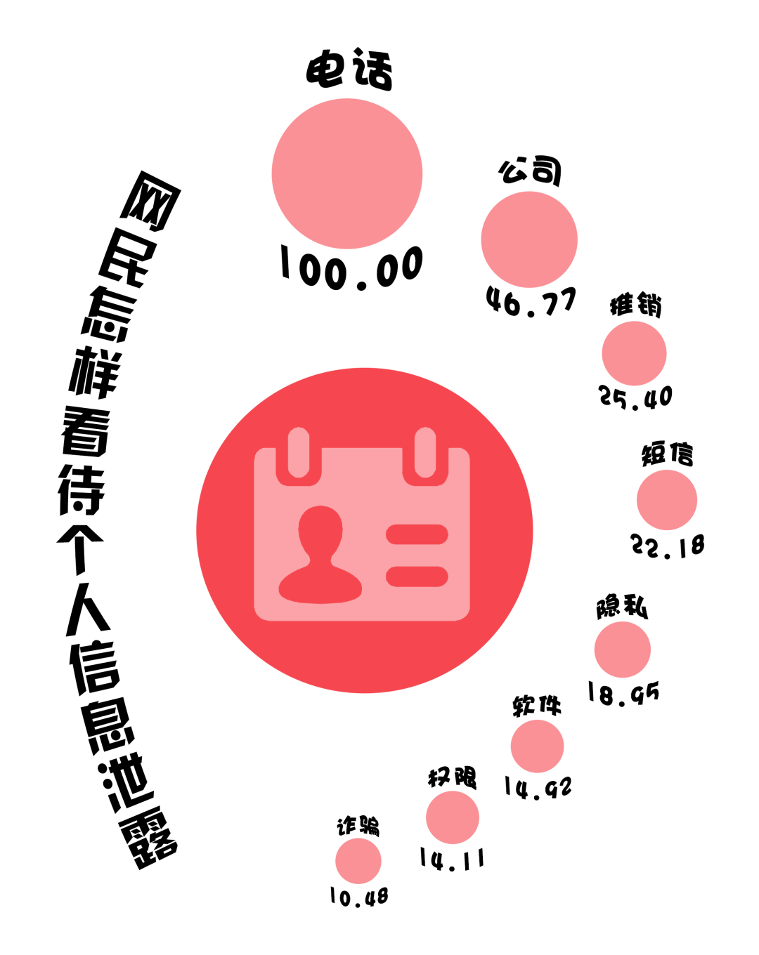 (數(shù)據(jù)來源:選取嗶哩嗶哩視頻《可怕!這7家科技公司盜取身份證信息,4.68億個人信息泄露》下的931條一級評論,做分詞及歸一化處理,進行分詞后將熱度最高的詞語規(guī)定為100)