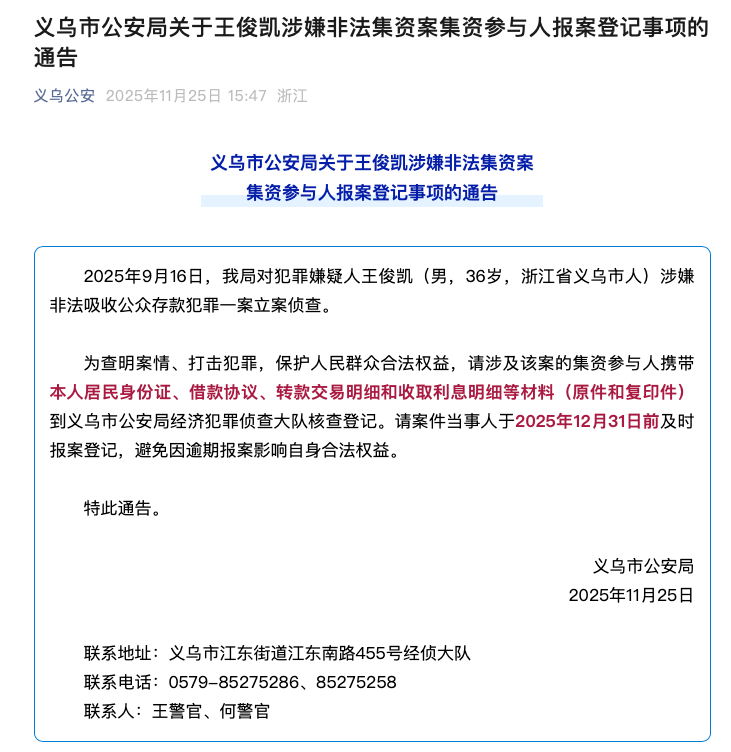 11月25日,義烏市公安局發(fā)布通告:2025年9月16日,我局對(duì)犯罪嫌疑人王俊凱(男,36歲,浙江省義烏市人)涉嫌非法吸收公眾存款犯罪一案立案?jìng)刹椤椴槊靼盖?、打擊犯罪,保護(hù)人民群眾合法權(quán)益,請(qǐng)涉及該案的集資參與人攜帶本人居民身份證、借款協(xié)議、轉(zhuǎn)款交易明細(xì)和收取利息明細(xì)等材料(原件和復(fù)印件)到義烏市公安局經(jīng)濟(jì)犯罪偵查大隊(duì)核查登記。請(qǐng)案件當(dāng)事人于2025年12月31日前及時(shí)報(bào)案登記,避免因逾期報(bào)案影響自身合法權(quán)益。