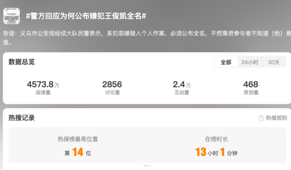 11月26日,義烏市公安局經(jīng)偵大隊(duì)民警接受媒體采訪時(shí)回應(yīng)稱,“系犯罪嫌疑人個(gè)人作案,必須公布全名,不然集資參與者不知道他是誰(shuí)”。網(wǎng)民普遍認(rèn)可義烏警方的說(shuō)法,認(rèn)為警方回應(yīng)質(zhì)疑維護(hù)透明執(zhí)法,批評(píng)部分媒體及自媒體“標(biāo)題黨”行為。有媒體分析,從執(zhí)法的角度來(lái)看,警方的通告使用“王俊凱”全名于法有據(jù)、于理有因。畢竟,非法集資案件涉及眾多受害人,資金流向復(fù)雜,偵查過(guò)程需要最大程度地征集線索、固定證據(jù)。若僅用“王某某”這類模糊指代,確實(shí)會(huì)造成集資參與者無(wú)法準(zhǔn)確識(shí)別、錯(cuò)失報(bào)案時(shí)機(jī),影響偵辦效率。