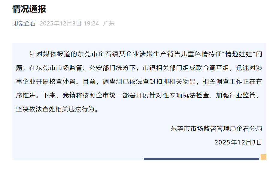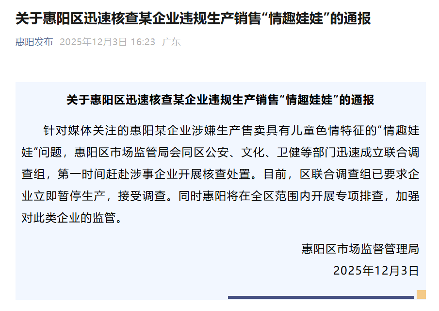 12月3日上午,廣東惠州惠陽(yáng)區(qū)市場(chǎng)監(jiān)督管理局一名工作人員表示,針對(duì)報(bào)道披露的事件,惠陽(yáng)區(qū)相關(guān)領(lǐng)導(dǎo)高度重視,已召集多部門進(jìn)行聯(lián)合研判。3日下午,惠陽(yáng)區(qū)市場(chǎng)監(jiān)督管理局發(fā)布情況通報(bào),已會(huì)同區(qū)公安、文化、衛(wèi)健等部門迅速成立聯(lián)合調(diào)查組,要求企業(yè)立即暫停生產(chǎn),接受調(diào)查,同時(shí)將在全區(qū)范圍內(nèi)開展專項(xiàng)排查。3日下午,上海市奉賢區(qū)市場(chǎng)監(jiān)督管理局一名工作人員表示,針對(duì)此事,正在調(diào)查中。3日晚間,東莞市市場(chǎng)監(jiān)督管理局企石分局通報(bào)稱,在東莞市市場(chǎng)監(jiān)管、公安部門統(tǒng)籌下,市鎮(zhèn)相關(guān)部門組成聯(lián)合調(diào)查組,目前已依法查封扣押相關(guān)物品,接下來(lái)將按照全市統(tǒng)一部署開展針對(duì)性專項(xiàng)執(zhí)法檢查。