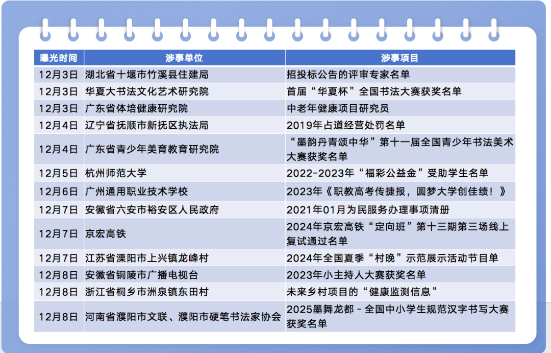 12月5日,有網(wǎng)民稱,杭州師范大學(xué)人文學(xué)院官網(wǎng)發(fā)布的《關(guān)于“多彩送教淳滋味”福彩公益金項目受助對象公示(線上課程3)》名單與百度文庫“10000中國普通人名大全”中的姓名及排序完全吻合,輿論對公益項目真實性和資金使用情況產(chǎn)生質(zhì)疑。12月6日上午,杭州師范大學(xué)發(fā)布初步情況說明稱,學(xué)校對此高度重視,已組建調(diào)查小組,將本著嚴肅負責(zé)的態(tài)度,詳細核查有關(guān)情況,嚴格依規(guī)處置。當(dāng)日下午,該校發(fā)出詳細情況通報,承認“工作人員弄虛作假”,并定性為“相關(guān)工作人員作風(fēng)不嚴不實,相關(guān)部門和學(xué)院監(jiān)管不力”,同時公布受助學(xué)生及項目資金使用情況。“#杭州師范大學(xué)通報調(diào)查結(jié)果#” 話題登上熱搜第一。然而該通報發(fā)出后,部分網(wǎng)民對于部分采購項目金額仍存疑議。