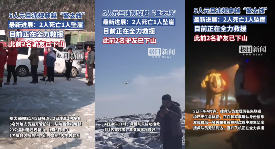 1月3日,有網(wǎng)民發(fā)帖稱“元旦期間5人穿越‘小鰲太線’,4人失聯(lián)”,引發(fā)關(guān)注。1月5日晚,“太白融媒”微信公眾號發(fā)布通報稱,1月2日凌晨2時左右,5名外地人員避開管護站,從黃柏塬鎮(zhèn)23公里附近違規(guī)登山。1月3日上午,1名穿越人員自行下山,其他4人失去聯(lián)系。當?shù)仉S后組織救援人員進山全力搜救。1月4日11時,救援隊成功搜救到1人,其身體狀況良好。1月5日下午4時許,救援隊又發(fā)現(xiàn)2名失聯(lián)者,已無生命體征,同時發(fā)現(xiàn)最后1名失聯(lián)者在探險過程中發(fā)生墜崖事故,現(xiàn)場坡陡崖高,搜救隊員無法到達,出動了直升機全力救援。