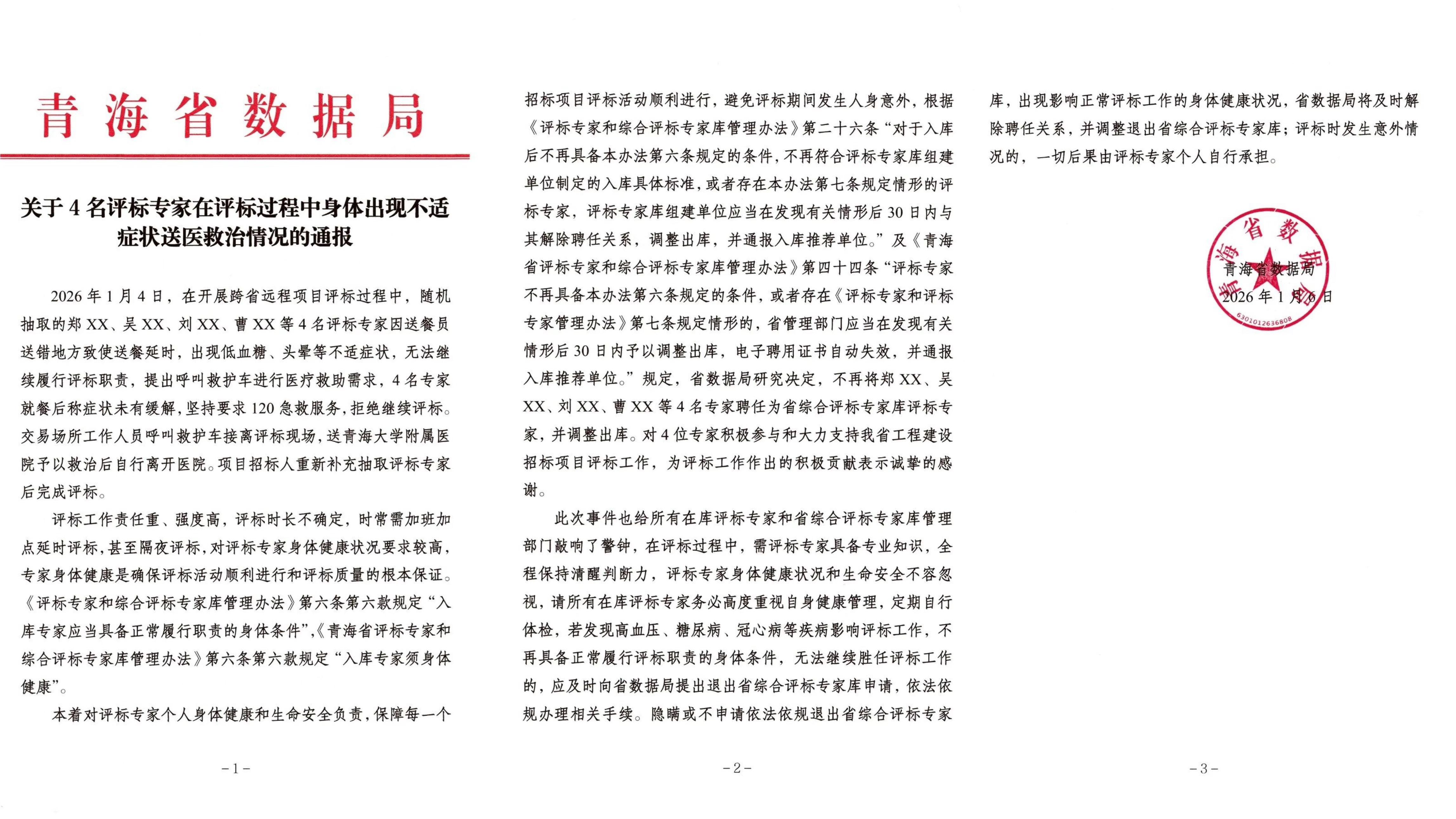 1月7日,青海省數(shù)據(jù)局在青海省公共資源交易網(wǎng)發(fā)布《關于4名評標專家在評標過程中身體出現(xiàn)不適癥狀送醫(yī)救治情況的通報》。通報稱,1月4日,4名評標專家因送餐延時出現(xiàn)低血糖、頭暈等不適癥狀,無法繼續(xù)履行評標職責,提出呼叫救護車進行醫(yī)療救助需求,4名專家就餐后稱癥狀未有緩解,堅持要求120急救服務,拒絕繼續(xù)評標。此后交易場所工作人員將其送青海大學附屬醫(yī)院救治,項目招標人重新補充抽取評標專家后完成評標。通報表示,省數(shù)據(jù)局研究決定,不再將上述4名專家聘任為省綜合評標專家?guī)煸u標專家,并調整出庫。
