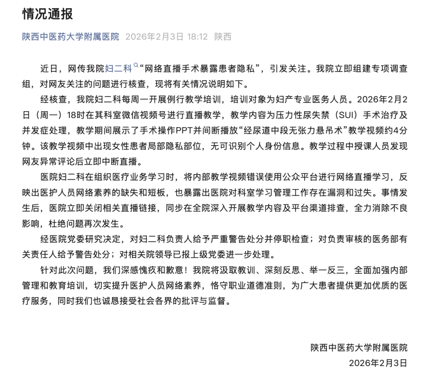 我院婦二科每周一開展例行教學(xué)培訓(xùn),培訓(xùn)對(duì)象為婦產(chǎn)專業(yè)醫(yī)務(wù)人員。2月2日18時(shí)其科室微信視頻號(hào)進(jìn)行直播教學(xué),視頻中出現(xiàn)女性患者局部隱私部位,無可識(shí)別個(gè)人身份信息。教學(xué)過程中授課人員發(fā)現(xiàn)網(wǎng)民異常評(píng)論后立即中斷直播。科室將內(nèi)部教學(xué)視頻用于公眾平臺(tái)直播,暴露醫(yī)護(hù)人員網(wǎng)絡(luò)素養(yǎng)不足及醫(yī)院管理漏洞。醫(yī)院已關(guān)閉直播鏈接、開展全院排查,并對(duì)婦二科負(fù)責(zé)人給予嚴(yán)重警告及停職檢查處分,對(duì)醫(yī)務(wù)部相關(guān)責(zé)任人給予警告處分,相關(guān)院領(lǐng)導(dǎo)已報(bào)上級(jí)黨委處理。醫(yī)院對(duì)此深表愧疚歉意,承諾將汲取教訓(xùn)、加強(qiáng)管理,提升醫(yī)護(hù)人員素養(yǎng),誠懇接受社會(huì)監(jiān)督。