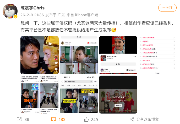 2月9日,周星馳經(jīng)紀(jì)人“@陳震宇Chris”發(fā)現(xiàn)近期某短視頻平臺(tái)上AI生成的周星馳經(jīng)典電影片段被大量傳播,并在微博上發(fā)問:“這些屬于侵權(quán)嗎?創(chuàng)作者可能已經(jīng)借此盈利,平臺(tái)是否放任不管?”相關(guān)言論迅速在網(wǎng)絡(luò)引發(fā)熱議,將“AI魔改”視頻再次推上輿論風(fēng)口浪尖。