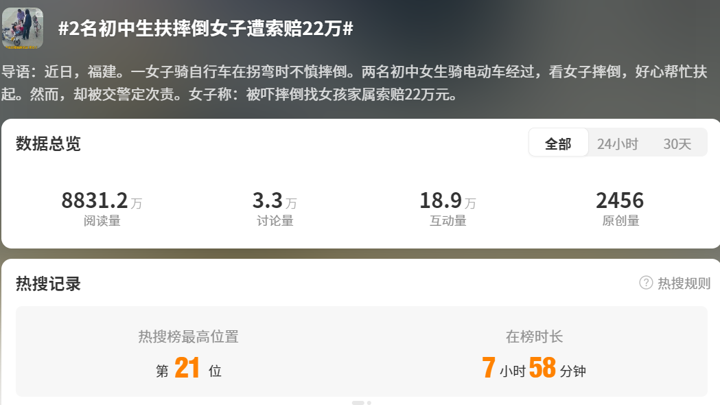 截至2月24日14時(shí),全網(wǎng)信息總量8萬余條,相關(guān)話題“#女兒扶人遭索賠22萬媽媽發(fā)聲#”“#2名初中生扶摔倒女子遭索賠22萬#”“#初中生遭索賠22萬爭(zhēng)議焦點(diǎn)在哪#”等累計(jì)閱讀量超2億。