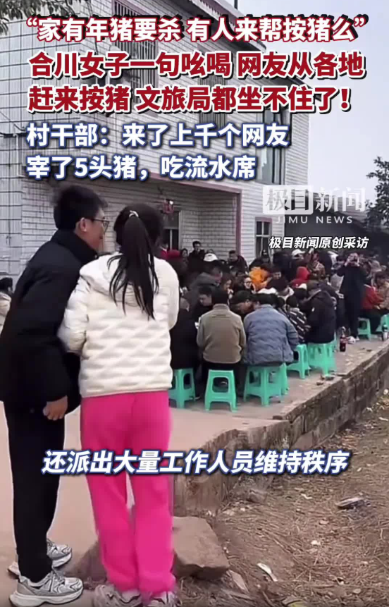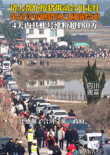 1月9日凌晨,來自重慶合川的抖音博主“呆呆”發(fā)視頻稱,1月11日家中要?dú)深^豬,因?yàn)楦改改挲g大了按不住,希望有人幫忙按豬,將請(qǐng)吃刨豬湯答謝,“呆呆”還開玩笑稱“就想家門口停滿車,在村里揚(yáng)眉吐氣一回”。短短兩日,視頻點(diǎn)贊量突破18萬,轉(zhuǎn)發(fā)量超14萬,“呆呆”建立的6個(gè)500人的“刨豬湯”群很快滿員。盡管“呆呆”連夜采購(gòu)食材并報(bào)備派出所,但已無法阻止網(wǎng)民熱情。1月10日凌晨,合川文旅緊急抽調(diào)工作人員趕赴現(xiàn)場(chǎng),協(xié)助保障活動(dòng)順利進(jìn)行。1月11日,來自全國(guó)各地超4000名網(wǎng)民匯聚“呆呆”家鄉(xiāng),其中不乏“鹵鵝哥”等知名網(wǎng)紅。1月11日至12日,“呆呆”連開多場(chǎng)直播,邀請(qǐng)網(wǎng)民參加家鄉(xiāng)大聯(lián)歡,直播間觀看和點(diǎn)贊人數(shù)均超3000萬人次。在合川文旅、愛心企業(yè)、網(wǎng)民等多方贊助下,原計(jì)劃的兩頭豬增至五頭,現(xiàn)場(chǎng)設(shè)五個(gè)分會(huì)場(chǎng)分散人流,公安部門疏導(dǎo)交通。合川文旅部門帶著本地特產(chǎn)、景區(qū)門票到現(xiàn)場(chǎng),講解“刨豬宴”和合川歷史文化,還設(shè)置篝火、煙花、舞龍等環(huán)節(jié)。據(jù)現(xiàn)場(chǎng)網(wǎng)民透露,當(dāng)?shù)匾还矓[了300桌宴席,最多時(shí)同時(shí)有超3000人。該事件引發(fā)熱烈討論,“殺豬女孩呆呆一天漲粉150萬”“呆呆殺豬宴一天蒸1000多斤大米”等多個(gè)話題沖上社交平臺(tái)熱搜。