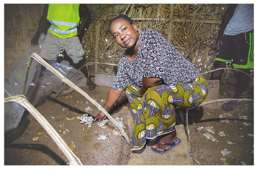 在中非共和國首都班吉附近的大馬拉地區(qū),盛夏7月的午后時分,太陽熱辣,一間約6平方米、四壁用棕櫚葉遮陰的菇棚里卻幽暗清涼。棚內(nèi)有兩個長2米、寬1米的畦床,其間星羅棋布地點綴著剛萌出的數(shù)十簇平菇。40歲的法蒂瑪蹲在土埂上,用手撥弄著飽滿的灰白色菌蓋,臉上難掩豐收的喜悅。