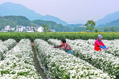 安徽省黃山市休寧縣鹽鋪村農(nóng)民在采摘“徽州貢菊”。施亞磊攝/光明圖片
