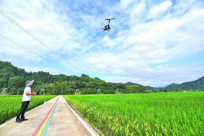 在浙江省杭州市臨安區(qū)太陽(yáng)鎮(zhèn)的稻田內(nèi),90后新農(nóng)人余岳峰操作農(nóng)用無人機(jī)在田間作業(yè)。 新華社發(fā)